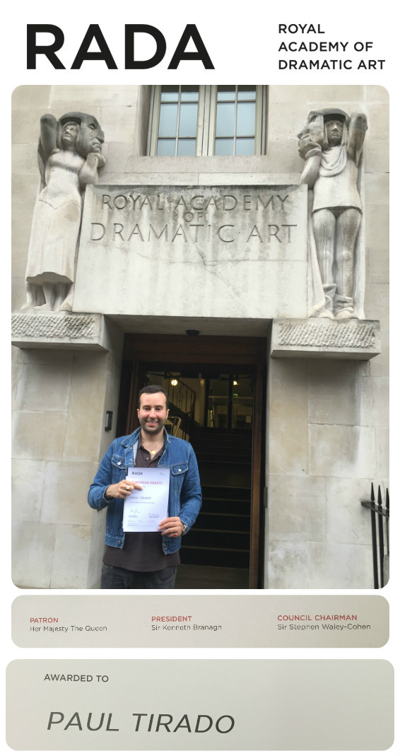 I’m so happy I’d completed successfully my intensive course at RADA as well. I got a great time, not only as an actor but also as a person. Also, being awarded with an official certificate with your name right next to Her Majesty The Queen as the Patron and Sir Kenneth Branagh as the President, what an amazing experience. I’m very happy, proud and honored! : )